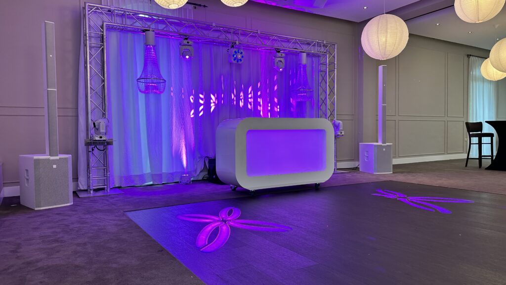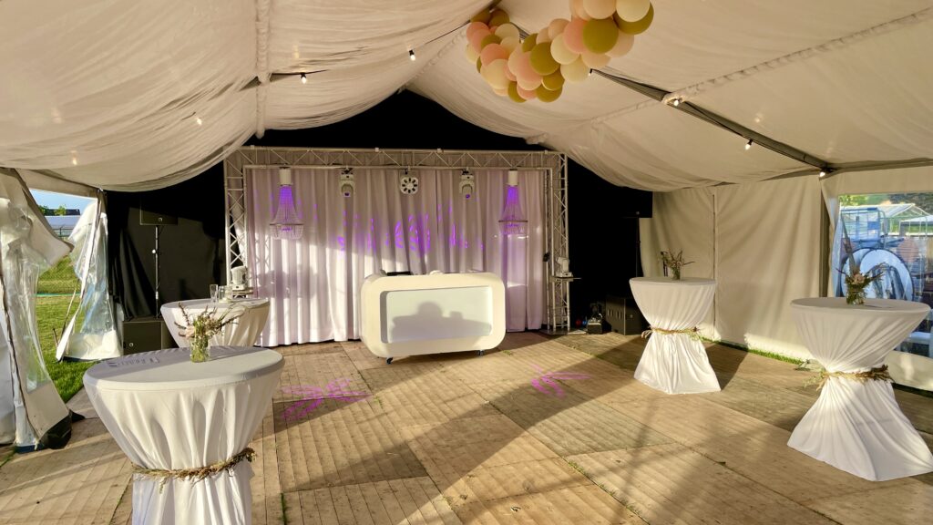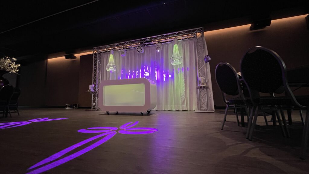 Centraal in de show staat het prachtige hoogglans witte DJ-meubel, voorzien van subtiele LED-verlichting die in elke gewenste kleur kan worden ingesteld. Dit vormt een harmonieus geheel met de grote achterwand van glossy doek, die zorgt voor een luxe en serene uitstraling.
