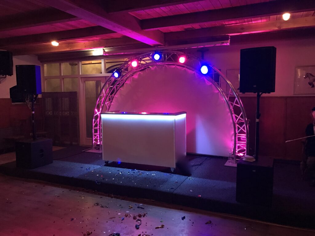 Zeer mooie show, met led verlichting in alle denkbare kleuren, bewegend licht voor een levendig geheel en perfect geluid. De achterwand van 4 meter gebogen truss is afgewerkt met wit doek. Aan de gebogen truss zijn 5 led spots gemonteerd die rgbwa+uv kleur meninging hebben, (werkelijk alle kleuren kunnen hiermee gemaakt worden) ook 2 led movingheads (washes) gaan mee in de lichtshow. In het midden van de truss zit nog een center effect (laser/moonflower/uv). De dunne nevel zorgt dat de lichtstralen goed uitkomen.